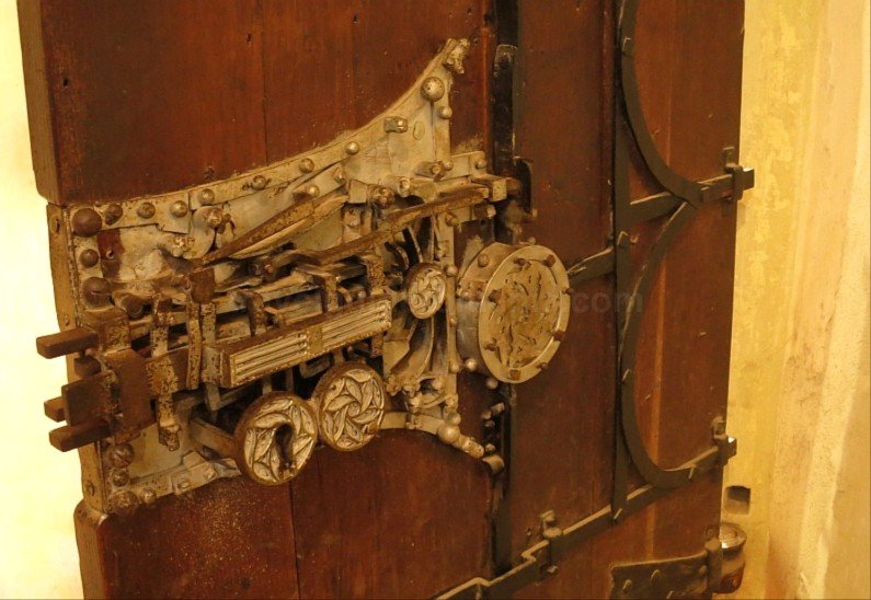 The key activates four mechanisms and the crank another fifteen. The lock blocks the door in 13 points, so that the goods of the church may be kept safely in the sacristy.