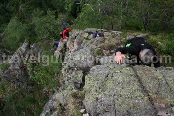 Minimal mandatory equipment: mountaineering helmet, soft sole trainers (which replace the climbing boots for the nonce). We recommend that the trainers have a better adherence on rocks (like the Vibram sole). Take a rain and wind jacket, and if it is autumn/spring take some gloves and a hat.