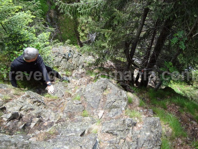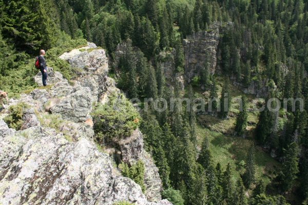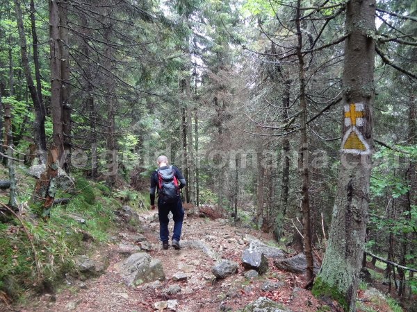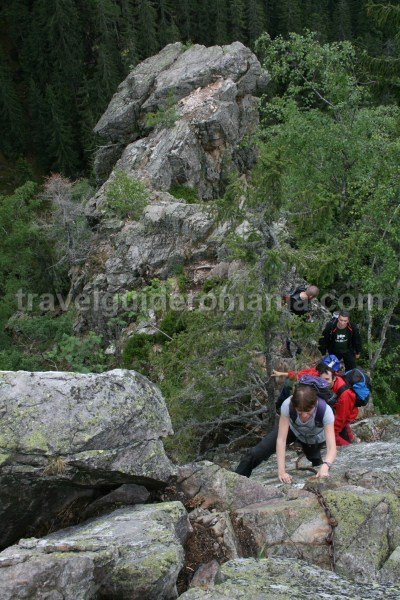 After trekking a forested area, our climbing skills are tested by a granite wall. Shortly thereafter, we get to a forest and then to the main ridge where the route intersects with another leading from Stana de Vale towards Padis.
