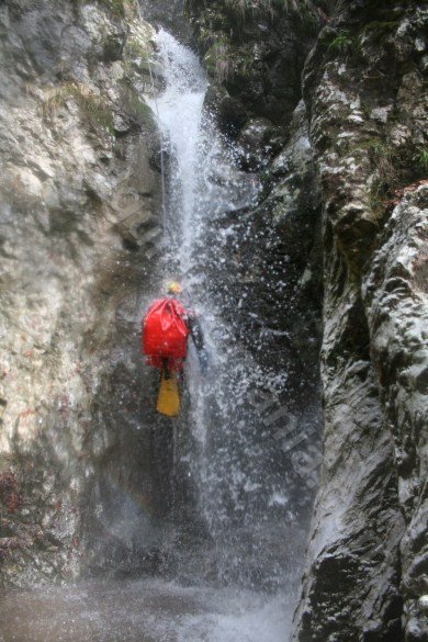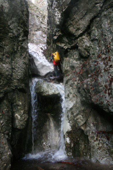 Fifth pitch: it is 6m high and it consists of 2 rocky steps which can be overpassed in one rappel. All anchors are on the left side of the canyon. There are two rings for setting up a fixed line and two rappel rings.