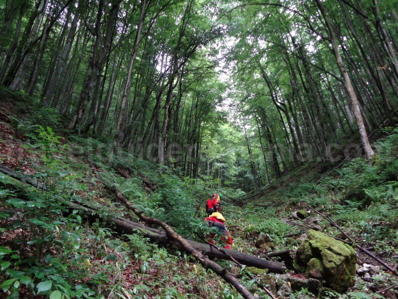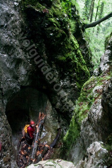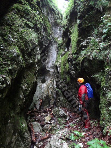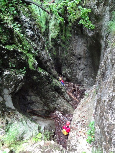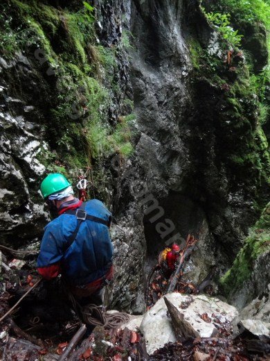Third pitch: 9m high. It is set up with two rappel rings and two rings for setting up a fixed line located on the left side of the valley. Then follows another almost horizontal section where the canyon gets wider.