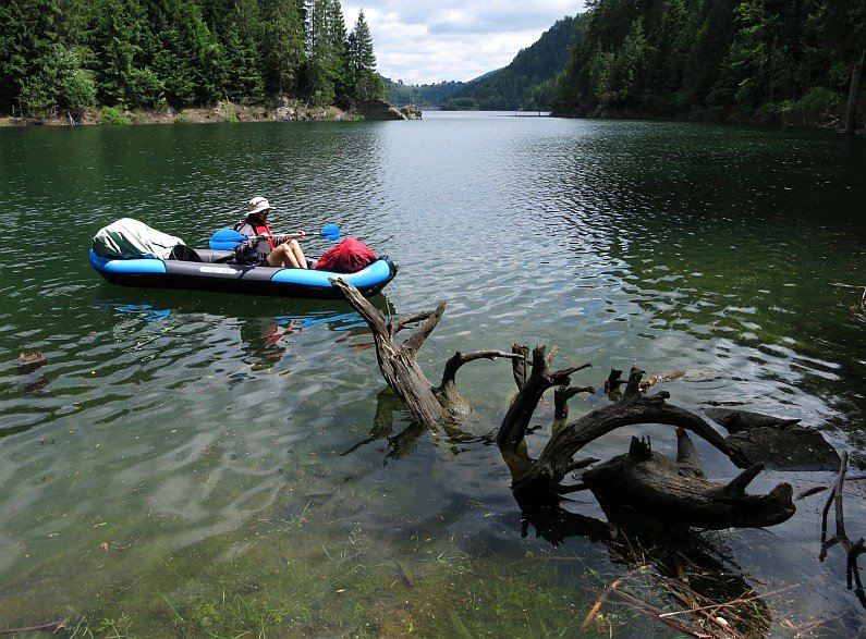 Besides, there are no other places to go to shore, the banks are steep and wooded. If you want to continue to the end of the lake, on the main arm, you still have to go on for 5 km.