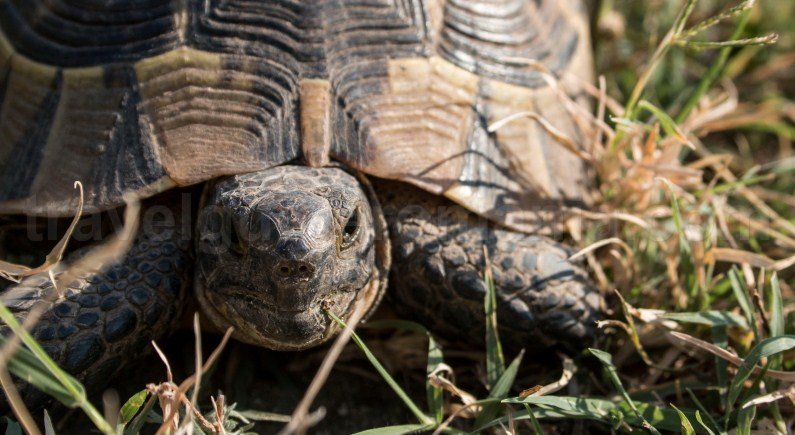 It is a land tortoise, protected by the law as a living monument of nature. It has a long shell of 20-30 cm, 15-20 cm wide, high, cambered, a short tail, covered by a whole plaque. In the shell the tortoise can take cover in its entirety: head and feet. It feeds by day, only with plants, sometimes with worms and snails.