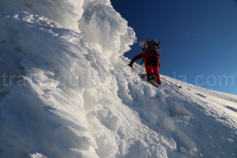 – The ascent is done on skis by attaching anti-slipping leather (sealskin) on the soles of the skis. The skis’ bindings are different than the ones for skiing on slopes, because it allows the foot to move freely. You can attach snowshoes crampons on the skis, thus allowing coverage on the ice. In areas with scarps that are too steep (both for ascent and descent), you will have to take off your skis (put them in your rucksack) and carry on by foot in crampons and with an ice pick.