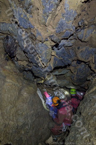 From the bottom of the 18m pit the gallery continues as the form of quite narrow meander. We reach the top of a 5m pit with a traverse line routes difficult to pass for shorter people.